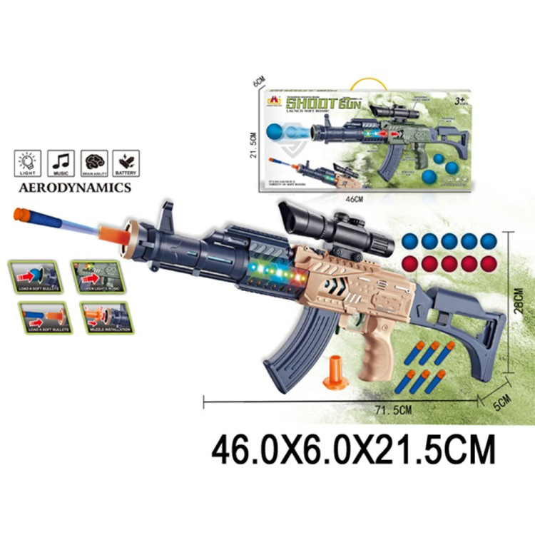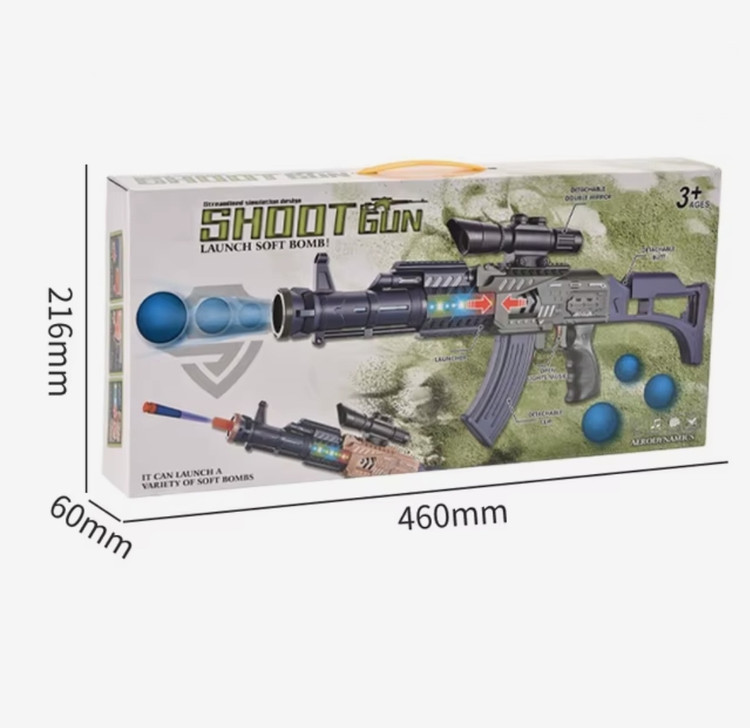- یک عدد تفنگ با طراحی تاکتیکی - دوربین پلاستیکی تزئینی - خشاب و لوله قابل اتصال - چند عدد توپ فومی نرم و ایمن - چند عدد تیر ابری چسبونکی مناسب برای سطوح صاف