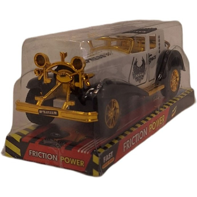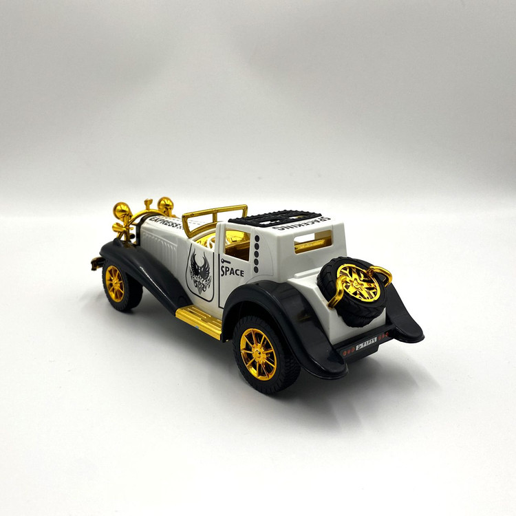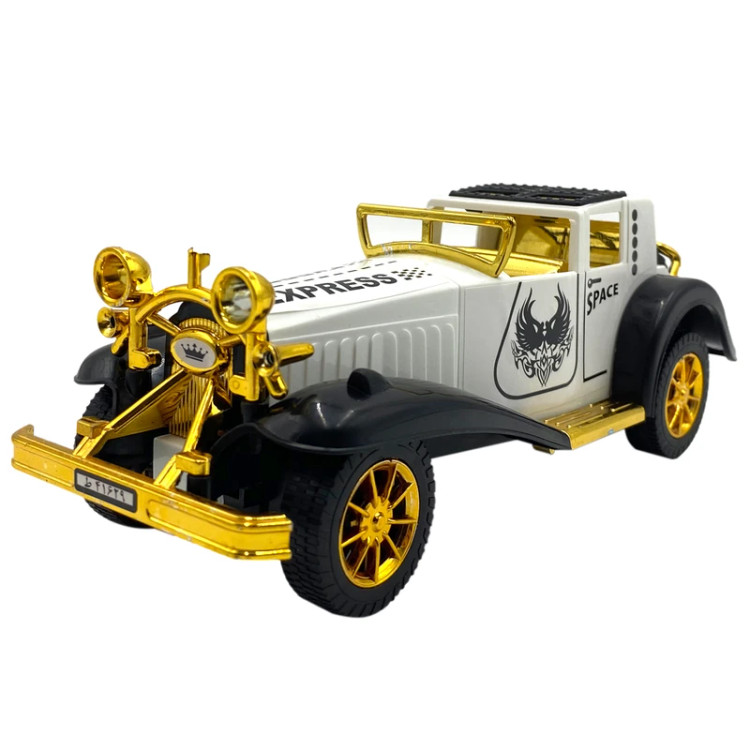 طراحی کلاسیک با رنگ سفید و مشکی - جزئیات طلایی در چرخها، جلوپنجره، چراغها و سپرها - رده سنی: مناسب برای کودکان ۳ سال به بالا - کاربرد: بازی، کلکسیون، دکور اتاق کودک یا نوجوان