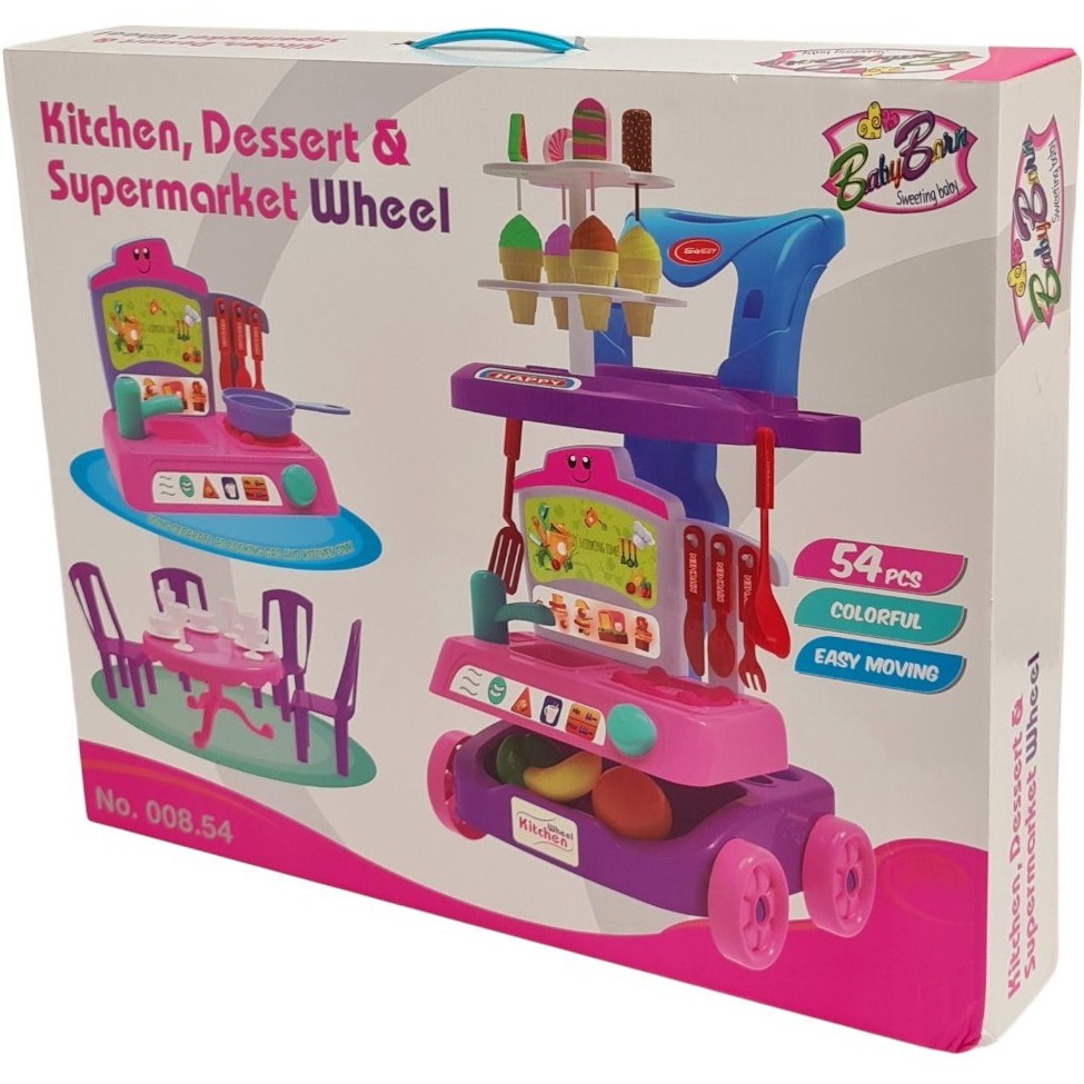 اسباب بازی سوپر مارکت و آشپزخانه رز گلد بی بی بورن با ابعاد 51×11×63 سانتیمتر و وزن 1905 گرم، دارای 54 قطعه رنگارنگ، بستهبندی جعبهای و مناسب برای دختران بالای 3 سال است.